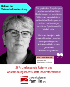 Britta Altenkamp, Vorsitzende des Zukunftsforum Familie e.V. (ZFF), betont: „Wir brauchen jetzt kein Inselreförmchen, sondern eine grundlegende, kohärente Reform des gesamten Abstammungsrechts. Es ist an der Zeit für eine Reform, die alle Kinder unterstütz. Das bedeutet soziale Elternschaft im Sinne des Kindeswohl ausdrücklich zu stärken, statt biologische Abstammung noch mehr in den Mittelpunkt zu stellen. Außerdem heißt es, die Vielfalt moderner Familien rechtlich abzusichern – insbesondere in queeren Familienkonstellationen und Patchworkfamilien mit der Möglichkeit einer einvernehmlichen Mehrelternschaft und der rechtlichen Gleichstellung von Zwei-Mütter-Familien. Zudem muss Diskriminierungs- und Gewaltschutz im Abstammungsrecht konsequent mitgedacht werden. Der vorliegende Entwurf schafft hingegen neue Unsicherheiten – gerade dort, wo Kinder Stabilität am dringendsten brauchen: in der Familie.