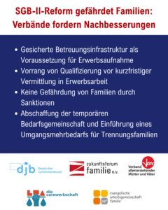 Mit einem gemeinsamen Appell wenden sich die Liga für unbezahlte Arbeit e. V. (LUA), der Deutsche Juristinnenbund e. V. (djb), das Zukunftsforum Familie e. V. (ZFF), der Verband alleinerziehender Mütter und Väter e. V. (VAMV) und die evangelische arbeitsgemeinschaft familie e. V. (eaf) an die Bundesregierung. Die Verbände fordern, dass die geplante Reform des SGB-II die besondere Situation von Menschen mit Fürsorgeverantwortung angemessen berücksichtigt. „Eine nachhaltige Erwerbsintegration braucht verlässliche Rahmenbedingungen. Wer Kinder betreut oder Angehörige pflegt, kann nicht unter Sanktionsdruck in den Arbeitsmarkt gezwungen werden, wenn die strukturellen Voraussetzungen fehlen“, so die gemeinsame Position.